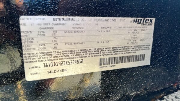 Description BRAND: Tuff Dump MODEL: TD-14S SIZE: 14 Foot GVWR: 3175 KG (7000 LB) GVWR/PNBV: 6350 KG (14000 LB) TIRES: ST235/80R16(E) LOCATION: Main Street Mower – CLERMONT, FL MANUFACTURER DATE: 12/2023